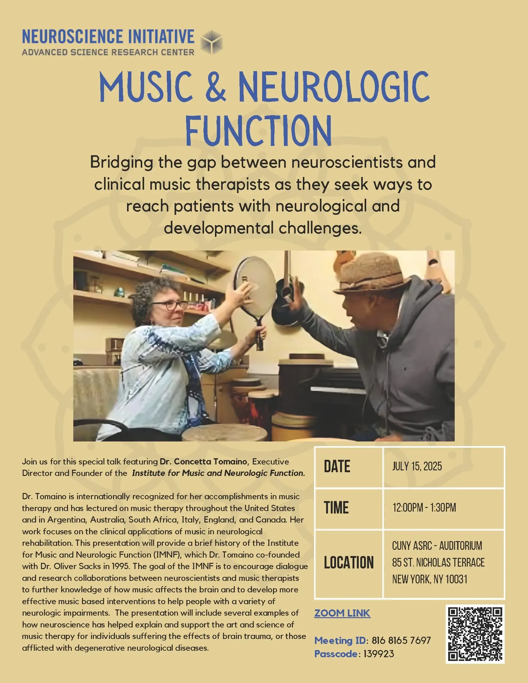 We’re excited to share that Dr. Concetta Tomaino, Executive Director and Founder of the Institute for Music and Neurologic Function (IMNF), will be presenting a special lecture as part of the