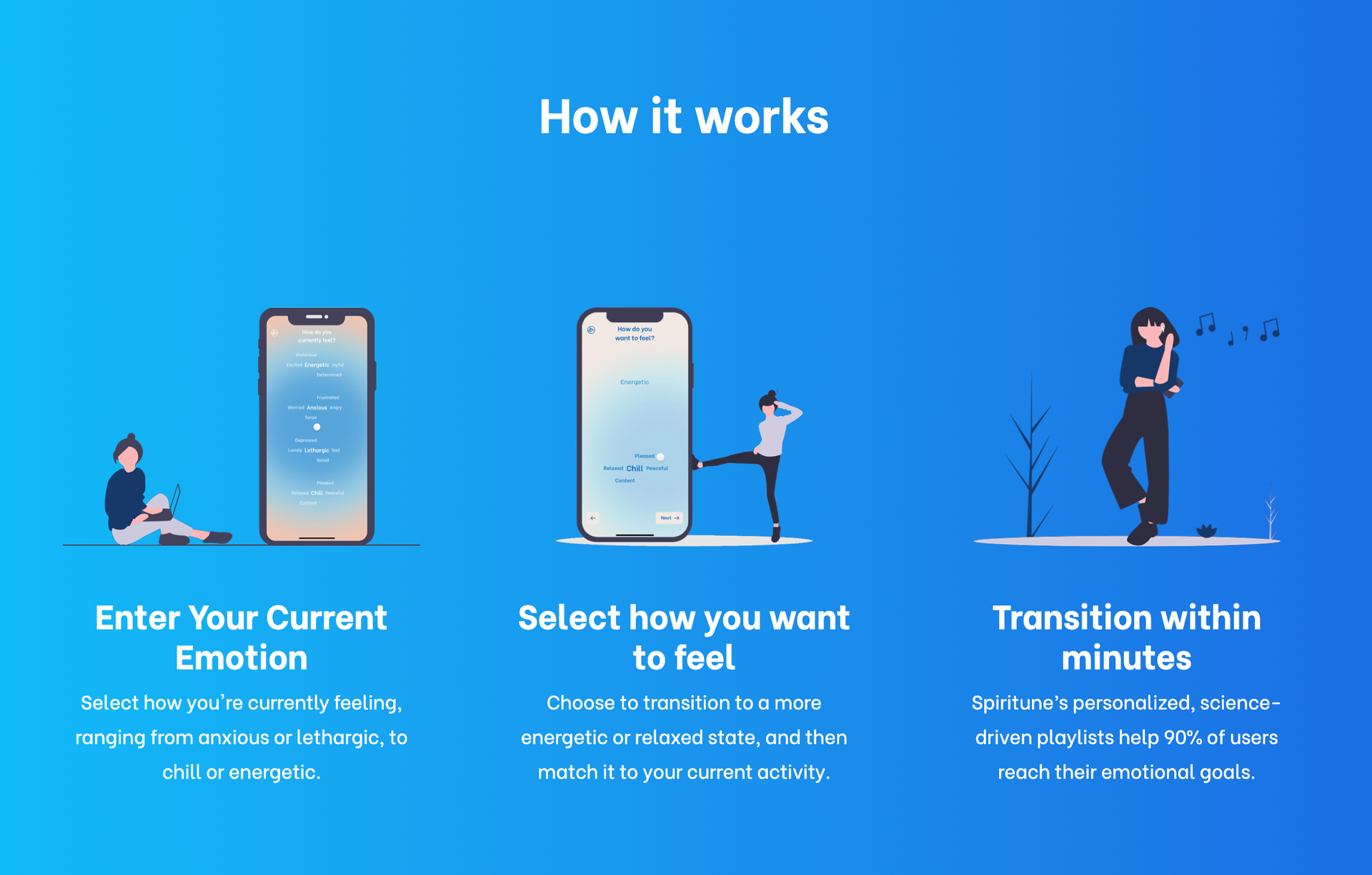 Their findings? Listening to Spiritune for just 10 minutes improved mood in 76% of participants. Not only that, but the study also showed that Spiritune was four times more effective than other music sources at reducing negative emotional states and was the only option tested that improved cognitive processing speed.